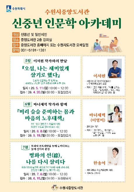 (비전21뉴스) 수원시 중앙도서관이 5월부터 7월까지 매달 1회 운영하는 ‘신중년 인문학 아카데미’ 수강생을 모집한다.