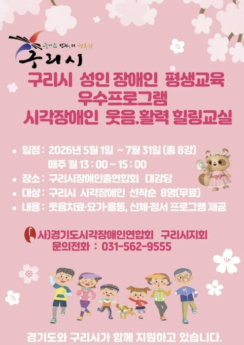 (비전21뉴스) 사단법인 경기도시각장애인연합회 구리시지회는 구리시와 경기도의 지원을 받아 2026년 5월부터 ‘시각장애인 웃음·활력 힐링 교실’을 운영할 예정이라고 밝혔다.