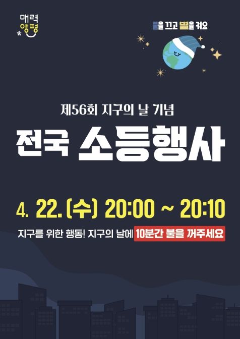 특히 지구의 날 당일인 22일 오후 8시부터 10분간 전 군민이 참여하는 ‘소등 행사’가 진행된다. 양평군청을 비롯한 관내 공공기관은 전면 소등에 참여하고, 공동주택과 일반 가정에서도 자율적으로 동참할 수 있도록 할 계획이다.