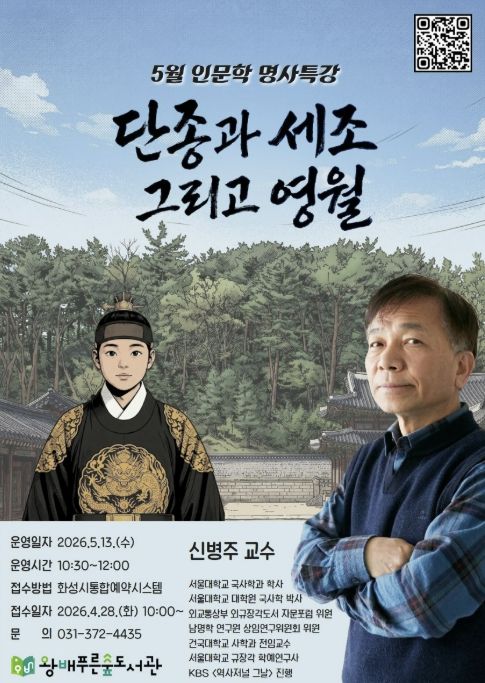 (비전21뉴스) 화성시문화관광재단 운영하는 왕배푸른숲도서관이 오는 5월 13일, 지역 주민들을 위해 역사학자 신병주 교수를 초청하여 5월 인문학 명사특강을 개최한다.