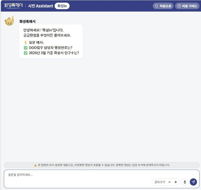 시는 기존 블로그, 조례, 주요 8개 민원 분야 정보를 중심으로 시범 운영해 오던 ‘화성in’에 생성형 AI 기능을 도입하고, 정보 제공 범위를 확대해 서비스를 고도화했다.