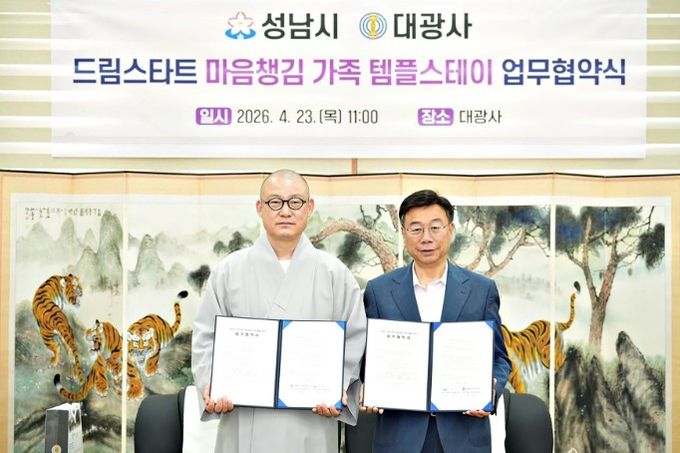 시는 이날 오전 11시 30분 분당구 구미동 불곡산 자락에 있는 대광사 지관전 접견실에서 신상진 성남시장과 도웅 대광사 주지스님 등이 참석한 가운데 ‘드림스타트 가족 마음챙김 템플스테이 추진에 관한 업무협약’을 했다.