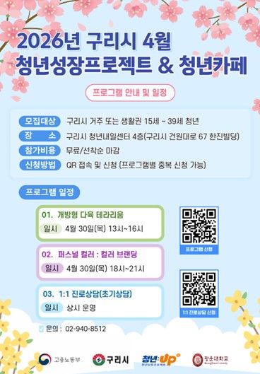 이번 4월 프로그램은 구리시에 거주하거나 생활권을 둔 15세부터 39세까지의 청년을 대상으로 하며, 구리시 청년내일센터 4층에서 진행된다. 참가비는 무료이며 프로그램별 중복 신청이 가능하다. 다만 모집은 선착순으로 마감된다.