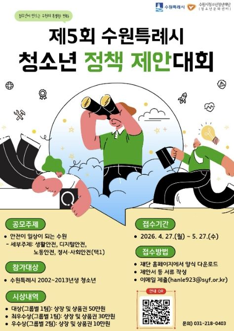 (비전21뉴스) 수원시청소년청년재단 수원청소년문화센터는 청소년이 정책을 기획하고 제안하는 ‘제5회 수원특례시 청소년 정책 제안대회’ 참가팀을 4월 27일부터 5월 27일까지 모집한다.