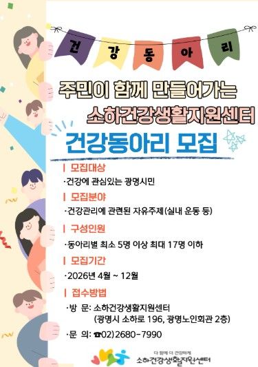 (비전21뉴스) 광명시 소하건강생활지원센터가 시민 스스로 건강을 관리하고 실천하도록 돕기 위해 오는 12월까지 ‘주민참여형 건강동아리’를 상시 모집한다.