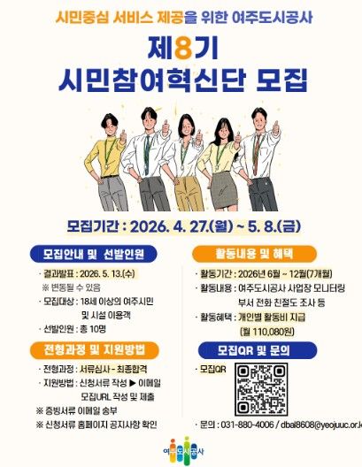 2026년 운영되는 시민참여혁신단 8기는 4월 27일부터 5월 8일까지 모집하며, 활동기간은 2026년 6월부터 12월까지이다. 선발된 혁신단은 공사의 시설·서비스·홍보에 대한 모니터링 활동과 혁신 아이디어 제안을 위한 운영회의 등 다양한 활동을 추진할 예정이다.
