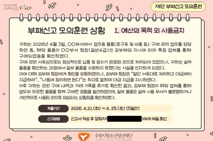 (비전21뉴스) 수원시청소년청년재단은 임직원의 부패 상황 인지 및 신고 역량을 강화하고 조직 내 청렴문화를 확산하기 위해 '2026년 부패신고 모의훈련'을 실시했다고 밝혔다.