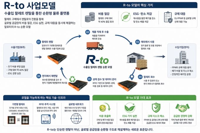 R-to 모델의 핵심은 ‘구매’에서 ‘렌탈’로의 전환이다. 기존에는 기업이 팔레트를 직접 구매해 단 한 번 사용하고 폐기했다면, R-to에서는 팔레트를 렌탈 형태로 공급받고, 사용 후에는 해외에서 회수된 팔레트를 현지 기업에 재공급하는 순환 구조를 형성한다. 이로써 팔레트는 일회성 비용이 아닌 반복적으로 활용되는 운영 자산으로 전환된다.