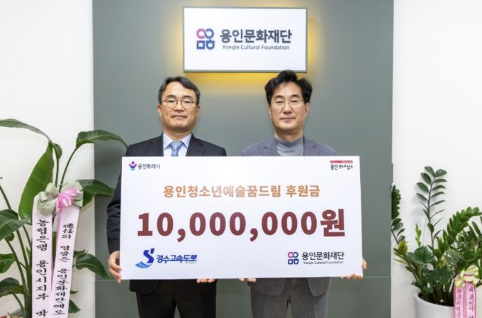 (비전21뉴스) 용인문화재단은 지난 23일 경수고속도로(주)로부터 용인시 관내 청소년 예술 장학사업인 ‘용인청소년예술꿈드림’ 지원을 위한 기부금 1,000만 원을 기탁받았다고 밝혔다. 이번 후원은 용인서울고속도로를 이용하는 통행차량 1대당 1원씩 적립하고, 사회공헌예산을 추가로 편성해 지역사회 환원과 기업의 사회적 책임 실천 차원에서 추진됐다.