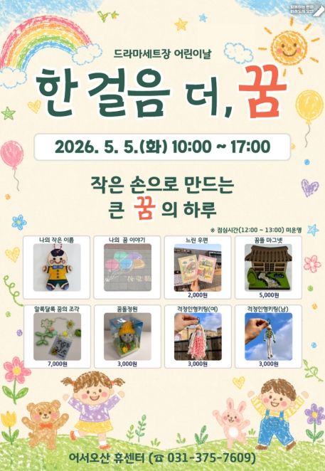 이번 프로그램은 어린이날을 기념해 아이들이 다양한 체험활동을 통해 자신의 생각과 꿈을 자유롭게 표현할 수 있도록 마련됐다. 드라마세트장과 어서오산 휴센터(休) 공간을 활용해 창의적이고 감성적인 체험 콘텐츠를 선보일 예정이다.
