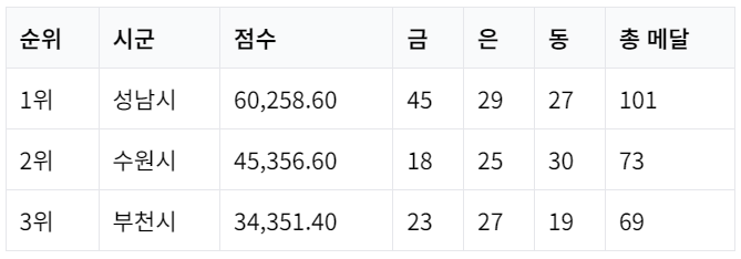 아래는 대회 3일차 기준 종합 순위와 메달 현황이다.