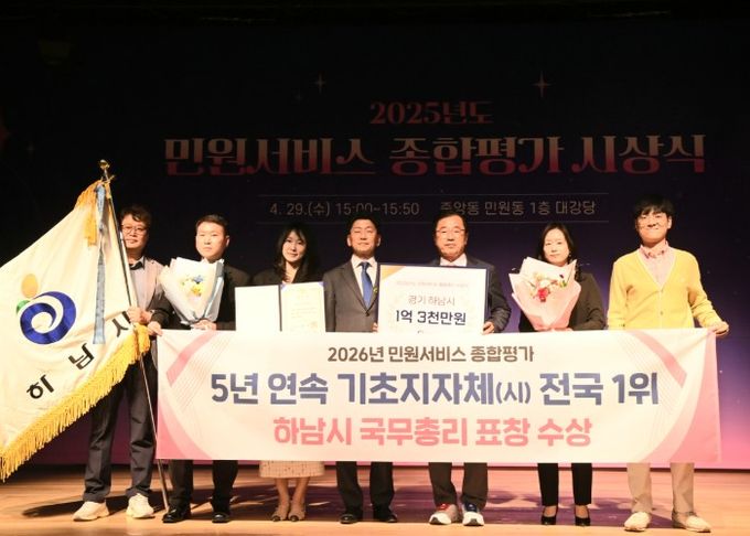 (비전21뉴스) 하남시가 전국 기초자치단체 중 최고 수준의 민원서비스 역량을 인정받으며 5년 연속 최우수 기관으로 선정됐다. 하남시는 29일 정부세종청사에서 열린 ‘2025년 민원서비스 종합평가’ 우수기관 시상식에서 국무총리 표창을 수상했다고 밝혔다.