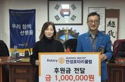 (비전21뉴스) 안성시동부무한돌봄네트워크팀은 지난 26일 국제로타리 3600지구 안성로타리클럽으로부터 촘촘한 복지 안전망 구축을 위한 후원금 100만 원을 전달받았다. 안성로타리클럽은 매년 지역사회를 위한 봉사와 나눔을 실천하며 지역 발전에 기여해 왔으며, 이번 후원금은 복지 사각지대 발굴과 사례관리 대상자에게 전문적인 복지 서비스를 제공하는 데 사용될 예정이다. 안성로타리클럽 이승재 회장은 “현장에서 발로 뛰며 소외된 이웃을 찾는 안성시동부무한돌봄네트워크팀의 활동에 실질적인 도움이 되길 바란다”며 “앞으로도 지역사회의 다양한 사회공헌 프로젝트를 통해 지역 복지 서비스의 질을 높이는 마중물이 되겠다”고 말했다. 안성시동부무한돌봄네트워크팀 정은주 센터장은 “복지 사업을 더욱 안정적이고 원활하게 추진할 수 있도록 도움을 주신 안성로타리클럽에 깊이 감사드린다”며 “지역 주민에게 필요한 맞춤형 복지 서비스를 제공하는 데 최선을 다하겠다”고 말했다