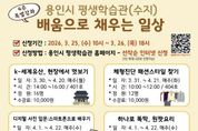 (비전21뉴스) 용인특례시는 25일부터 26일까지 수지구에 있는 용인시 평생학습관에서 특별강좌 수강생을 모집한다고 17일 밝혔다. 이번 특별강좌는 4주 과정으로, 시민의 수요를 반영해 실생활에 도움이 되는 다양한 강좌로 구성됐다. 총 8개 강좌를 운영하며 112명의 수강생을 모집한다. 주요 프로그램은 ▲인문교양 분야(K-세계유산, 현장에서 멋보기) ▲뷰티 분야(체형 진단 패션스타일 찾기) ▲정보화 분야(디지털 사진 입문: 스마트폰으로 배우기) ▲조리 분야(우리 집 김치 만들기) ▲문화예술 분야(쉽고 편한 보컬 발성법 야간) 등이다. 교육은 3월 30일부터 4월 24일까지 진행되며 만 19세 이상 용인시민이라면 누구나 신청할 수 있다. 용인에 주소를 둔 재외국민, 결혼이민자, 용인 소재 기업에 재직 중인 직장인도 참여 가능하다. 접수는 용인시 평생학습관 누리집을 통해 선착순으로 진행된다. 수강료는 강좌별 수업 시간에 따라 1만 원에서 1만 5000원이며, 재료비는 별도로 개인이 부담한다. 시 관계자는 “시민이 배움의 가치를 느낄 수 있도록 실생활에 도움이 되는 다