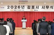 (비전21뉴스) 김포시가 2일 오전 10시, 시청 본관 3층 대회의실에서 ‘2026년도 시무식’을 열고 붉은 말 병오년(丙午年) 새해의 힘찬 출발을 알렸다. 이날 시무식에는 김병수 김포시장을 비롯해 실·국·소장, 부서장 등 간부 공직자 100여 명이 참석해 새해 시정 운영 방향을 공유하고, 시민 중심의 시정 추진과 새로운 도약을 향한 결의를 다졌다. 행사는 국민의례를 시작으로 공무원 헌장 낭독, 신년사 순으로 차분하고 엄숙하게 진행됐으며, 참석자들은 시무식을 통해 공직자로서의 사명과 책임을 다시 한 번 되새기는 시간을 가졌다. 김병수 김포시장은 신년사에서 “붉은 말의 해는 뜨거운 열정과 강한 추진력을 상징한다”며 “올해는 이 기운을 받아 ‘시민의 상상이 현실이 되는 김포’를 시민 한 분 한 분이 실제로 느낄 수 있도록 시정 역량을 집중해 나가겠다”고 밝혔다. 아울러 “속도감 있는 행정과 책임 있는 실천으로 김포의 미래 경쟁력을 더욱 높여 나가겠다”고 덧붙였다. 한편, 시무식을 마친 뒤 참석자들은 서로 새해 인사를 나누며 올 한 해 시정 운영에 대한 각오를 공유하는 시간을 가졌으며, 시민과 함께 성장