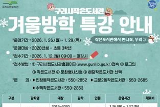 (비전21뉴스) 구리시는 ‘작은도서관 겨울방학 특강’ 참가자 모집을 오는 1월 12일 오전 9시부터 시작한다고 밝혔다. ‘작은도서관 겨울방학 특강’은 겨울방학을 맞은 어린이들이 멀리 있는 대형 도서관이 아닌, 집 가까운 우리 동네 작은도서관에서 다양한 방학 프로그램에 참여할 수 있도록 마련된 것으로, 1월 26일부터 관내 공립 작은도서관 3개소(교문2동·수택·인창동)에서 운영된다. 이번 특강은 각 도서관의 특색을 살린 ‘○○하는 겨울’ 시리즈로 기획돼, 어린이들이 한파를 피해 따뜻한 도서관에서 체험 중심의 활동에 몰입할 수 있도록 구성됐다. [교문2동작은도서관]에서는 어린이들의 예술적 감수성과 호기심을 자극하는 프로그램을 진행한다. 유아를 대상으로 한 음악 감성 수업‘노래하는 겨울Ⅰ’은 리듬과 선율로 겨울의 즐거움을 표현하며, 초등 저학년 대상 ‘마술하는 겨울’은 아이들이 직접 마술사가 되어 과학적 원리와 무대 표현을 배우는 이색 체험 행사로 운영된다. [수택작은도서관]은 미래 과학자를 꿈꾸는 어린이들을 위한 실험 중심 프로그램을 선보인다. ‘실험하는 겨울’ 시리즈는 유아와 초등학생을 대상으로 나이