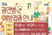 (비전21뉴스) 파주시는 반려견을 동반한 야외활동이 잦아지는 가을을 맞아 오는 20일부터 29일까지 생후 3개월 이상의 임신하지 않은 개를 대상으로 광견병 예방접종을 실시한다고 밝혔다. 광견병은 바이러스에 의해 사람과 동물 모두에게 감염될 수 있는 인수공통전염병으로, 잠복기가 상당히 길고 증세가 나타날 경우 치사율이 매우 높기 때문에 사람과 반려동물 모두를 위해 반려견은 매년 1회 반드시 예방접종할 것을 적극 권장하고 있다. 시는 하반기 광견병 예방사업을 위해 예방백신 4,500마리 분을 무상 지원하며, 예방접종을 희망하는 반려견 보호자는 33개 지정 동물병원을 방문해 시술비 1만 원만 부담하면 접종이 가능하다. 참여 동물병원 목록은 파주시청 누리집 공고문을 통해 확인할 수 있다. 동물병원이 없는 읍면지역은 시에서 직접 수의사를 파견해 순회접종을 진행하며, 이 경우 접종비 전액을 시에서 지원할 방침이다. 읍면지역 순회접종 일정은 해당 읍면 행정복지센터 산업팀에 문의하면 된다. 아울러 파주시는 야생동물의 광견병 전파를 막기 위해 광견병 미끼백신을 너구리 등 야생동물이 자주 출몰하는 관내 야산에 살포하