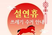 (비전21뉴스) 고양특례시 일산서구는 설 연휴 기간 주민 불편을 최소화하고 쾌적한 도시환경을 유지하기 위해 오는 14일부터 18일까지 5일간 생활폐기물 관리대책을 추진한다. 구는 ▲비상근무체계를 통한 신속한 청소행정 서비스 제공 ▲재활용품 분리배출·생활폐기물 감량 홍보 ▲연휴 기간 수거일 사전 안내 등을 실시해 올바른 쓰레기 배출을 유도할 방침이다. 이달 14일과 18일을 집중 수거일로 지정해 생활폐기물과 음식물 관련 폐기물을 정상 수거하고, 설 연휴 기간인 2월 15일부터 17일까지는 수거를 중단한다. 이에 따라 연휴 기간 중 생활쓰레기 배출 자제와 수거 일정 조정사항을 사전 홍보할 계획이다. 또한 연휴 기간, 총 17명 규모의 청소대책 상황반과 대응반을 편성·운영해 생활쓰레기 관련 민원과 무단투기 신고에 신속히 대응하고 쓰레기 투기 상습지역을 중심으로 순찰과 집중 수거를 병행한다. 구 관계자는 “설 연휴에도 주민들이 불편 없이 쾌적한 환경에서 명절을 보낼 수 있도록 청소행정 운영에 최선을 다하겠다”며 “주민들께서도 수거일을 준수하고 올바른 분리배출과 쓰레기 감량에 적극 협조해 주시길 바란다”고