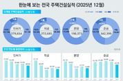 (비전21뉴스) 국토교통부는 2025년 12월 기준 주택 통계를 공표했다. 2025년 12월 주택 인허가, 착공, 분양, 준공 실적은 12월 수도권 인허가는 82,077호로 전년동월(119,541호) 대비 31.3% 감소, 12월 누적 실적은 222,704호로 전년동기(234,083호) 대비 4.9% 감소했다. 서울 지역 12월 인허가는 2,576호로 전년동월(18,441호) 대비 86.0% 감소, 12월 누적 실적은 41,566호로 전년동기(51,452호) 대비 19.2% 감소했다. 비수도권 12월 인허가는 20,712호로 전년동월(39,904호) 대비 48.1% 감소, 12월 누적 실적은 157,130호로 전년동기(201,151호) 대비 21.9% 감소했다. 12월 수도권 착공은 40,344호로 전년동월(29,965호) 대비 34.6% 증가, 12월 누적 실적은 166,823호로 전년동기(163,255호) 대비 2.2% 증가했다. 서울 지역 12월 착공은 10,050호로 전년동월(3,620호) 대비 177.6% 증가, 12월 누적 실적은 32,119호로 전년동기(26,066호) 대비