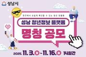 (비전21뉴스) 성남시는 오는 11월 16일까지 청년 정보 플랫폼 명칭을 공모한다. 해당 플랫폼은 성남시 청년정책과 지원사업, 청년 활동 공간, 행사 정보 등을 한곳에서 손쉽게 확인할 수 있는 온라인 통합 창구로, 내년 1월 서비스 개시 예정이다. 시는 이러한 성남 청년정보 플랫폼의 목적과 기능 등을 함축적으로 표현하는 명칭을 찾는다. 성남시민 누구나 참여할 수 있으며, 1명당 1개 명칭만 응모할 수 있다. 응모하려면 네이버폼 온라인을 접속해 제안 명칭(10자 이내)과 제안 사유(15자 이상) 적어 ‘제출 버튼’을 누르면 된다. 시는 서면 심사(11.17~21), 성남시청 홈페이지를 통한 시민 선호도 온라인 투표(11.24~12.4)를 거쳐 오는 12월 10일 당선작 5점을 선정한다. 선정자에게는 최우수(1명) 50만원, 우수(2명) 각 20만 원, 장려(2명) 각 5만원 등 총 100만원의 시상금을 성남사랑상품권으로 지급한다. 시 관계자는 “청년정책의 얼굴이 될 이름을 시민이 직접 정하는 뜻깊은 과정”이라면서 “청년이 공감하고 부르기 쉬운 이름을 선정해 청년
