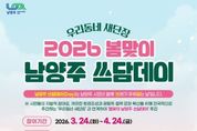 (비전21뉴스) 남양주시는 3월 24일부터 4월 24일까지 시 전역에서‘우리동네 새단장 봄맞이 남양주 쓰담데이’집중 추진기간을 운영한다고 밝혔다. 이번 행사는 새봄을 맞아 겨울 동안 방치된 쓰레기를 정비하고 쾌적한 생활환경을 조성하기 위해 마련됐다. 시민이 일상 속에서 자발적으로 참여하는 환경정화 문화를 확산하는 데 목적을 둔다. ‘남양주 쓰담데이’는 시가 운영하는 대표 시민참여형 환경정화 프로그램으로, 자원봉사단체와 지역사회단체, 상인회, 군부대 등 277개 기관단체가 참여한다.이번 활동은 행정안전부가 추진하는 전국 단위 환경정화 캠페인‘우리동네 새단장’과 연계해 추진됐다. 주요 활동은 △우리동네 취약지역 정화활동 △동절기 방치 폐기물 집중 수거 △하천과 공원 외래식물 퇴치 활동 △빗물받이 주변 낙엽, 담배꽁초 등 비점오염원 제거활동 등을 실시하여, 여름철 집중호우 대비 환경정비 효과를 높일 계획이다. 쓰담데이 활동 참여를 희망하는 시민은 남양주시 자원봉사센터 또는 거주지 읍면동 환경팀을 통해 신청할 수 있다. 아울러 시는 집중 추진기간 이후에도 읍면동 중심의‘마을 단위 쓰담데이’