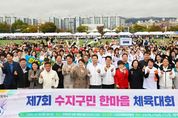 (비전21뉴스) 용인특례시 수지구는 18일 아르피아 상부 체육시설에서 ‘제7회 수지구민 한마음 체육대회’를 개최했다. 수지구 체육연합회가 주최·주관한 이번 대회엔 구민 약 2000여 명이 참여해 승부차기, 볼풀공 바구니농구, 줄다리기, 계주 등으로 구민 모두 한마음으로 어우러지는 시간을 보냈다. 또 식전 공연인 동천동 훌라댄스, 신봉동 밸리댄스와 단국대학교 치어리딩팀 ‘아스테르’의 공연, 퓨전 장구, 보컬그룹 ‘뮤랑’, 마술사 홍승인, 초대 가수 김성환 등이 다채로운 무대를 선보였다. 행사장 곳곳에선 화분 만들기, 친환경 리필스테이션(세제 담아가기), MBTI 검사, 캘리그라피 체험, 키링 만들기, 구민 건강 서비스 안내 부스 등 체험 프로그램이 운영됐다. 이상일 시장은 “우리 수지구민들이 모처럼 한자리에 모여 우정을 나누면서 행사를 통해 행복한 시간을 많이 보내시라고 비가 그친 것 같다”며 “수지중앙공원은 축구장 76개 크기의 시민 힐링 공간으로 조성되고 있고, 상현3동 행정복지센터와 함게 건립되는 광교스포츠센터에는 25m레인 10개의 수영장이 들어서게 된다"며 "서울종합운동장역과 수서역으로 연결