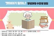 (비전21뉴스) 안성시 중앙도서관은 오는 10월 29일부터 12월 24일까지 매주 수요일 오전 10시부터 12시까지(총9회) 진행되는 『옛이야기 할머니』양성과정의 수강생을 모집한다. 이번 과정은 우리 전통 설화와 구전문화를 이해하고, 이를 바탕으로 어린이들에게 옛이야기를 들려줄 수 있는 이야기 구연 역량을 키우는 특화 교육 프로그램으로 교육은 송경애 강사(한국국학진흥원 및 아름다운 이야기 할머니 교육강사)가 진행하며, 이야기 전달 기법, 발성 훈련, 스토리텔링 실습 등 실질적인 교육 중심으로 구성된다. 참여 대상은 60세 이상 여성 20명으로, 접수는 10월 14일부터 도서관 홈페이지, 전화 또는 방문을 통해 신청할 수 있다. 도서관 관계자는 “지역 어르신들이 삶의 지혜와 전통 이야기를 전하며 세대 간 소통의 다리를 놓는 뜻깊은 과정이 될 것이고 본 과정을 수료한 참여자들은 2026년 ‘책 읽어주기’ 자원봉사 프로그램에 참여할 수 있도록 안내할 계획이다.”라고 전했다.