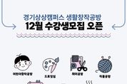 (비전21뉴스) 경기문화재단 경기상상캠퍼스(대표이사 유정주)는 겨울 시즌 생활창작공방 프로그램 참여자를 오는 17일부터 모집한다. 생활창작공방은 경기상상캠퍼스 생생1990에 위치한 경기생활문화센터 교육 커뮤니티 공간으로, 도민이 일상 속에서 다양한 창작 활동을 경험할 수 있도록 재단공방, 어린이창작공방, 드로잉실, 취미공방, 직물공방, 커피공방, 사진촬영실까지 총 7개의 특화 공간을 운영하고 있다. 11월에는 총 11개의 프로그램이 구성돼 있으며, 주요 프로그램으로는 △Set in wool(울조끼와 가방 만들기), △오롯이 나에게 집중하는 시간: 4주 터프팅 힐링 프로젝트, △내 생애 첫 그림- 알기 쉬운 민화'일월오봉도', △그림책 마음 놀이터 등이 있다. 12월에는 △오일파스텔로 만드는 2026년 달력 △우리들의 예술놀이터, △복을 담는 라탄 복조리 만들기, △복을 쓸어 담는 모시 빗자루 만들기, △커피의 감별과 추출 방법: 커핑까지 총 5개의 프로그램이 운영될 예정이며, 수강 신청은 11월 14일부터 각 프로그램 시작 4일 전까지 경기상상캠퍼스 누리집을 통해 가능하다. 경기상상캠퍼스 내 생활창