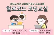 (비전21뉴스) 김포시 풍무도서관에서는 초등학생 3~5학년을 대상으로 ‘할로코드 코딩교실’을 오는 2월 7일부터 2월 28일까지 매주 토요일 오후 1시부터 3시까지 총 4회에 걸쳐 운영한다. 해당 프로그램은 홍혜은 코딩 강사가 진행하며, 피지컬 컴퓨팅 보드를 활용한 체험 활동으로 구성된다. 참여자들은 LED아이언맨 원자로 작동시키기, 실내 소음측정봇 만들기, 할로코드 통신기 제작 등 코딩을 직접 체험해 보면서 원리를 자연스럽게 익혀 쉽고 재미있게 코딩을 배우는 시간을 가질 수 있다. 참여 신청은 1월 20일 오전 10시부터 풍무도서관 홈페이지에서 가능하며, 초등학생 3~5학년 12명을 선착순 모집한다.