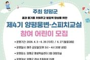 (비전21뉴스) 양평군은 관내 초등학생의 논리적 사고와 발표 능력 향상을 위해 오는 4월 3일부터 ‘제4기 양평웅변·스피치교실’을 운영한다. 이번 프로그램은 어린이들이 대중 앞에서 자신의 생각을 논리적으로 표현하고 발표에 대한 자신감을 기를 수 있도록 마련된 교육 과정이다. 교육은 4월 3일부터 6월 26일까지 총 13주 과정으로 진행되며, 매주 금요일 오후 3시부터 4시 20분까지 양평군 평생학습센터 2층 대회의실에서 열린다. 6월 27일에는 그동안 배운 내용을 발표하는 발표대회도 평생학습센터 4층 온누리실에서 진행될 예정이다. 양평웅변·스피치교실은 관내 웅변·스피치 분야의 강사인 백현진 강사의 재능기부로 운영되며, 관내 초등학생이면 누구나 참여할 수 있다. ‘제4기 양평웅변·스피치교실’ 참여 접수 기간은 3월 16일 오전 9시부터 3월 20일 오후 6시까지이며, 희망자는 홍보문에 있는 정보 무늬(QR 코드)를 통해 온라인으로 신청할 수 있다.